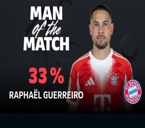 打进一球,格雷罗当选拜仁vs圣保利全场最佳球员