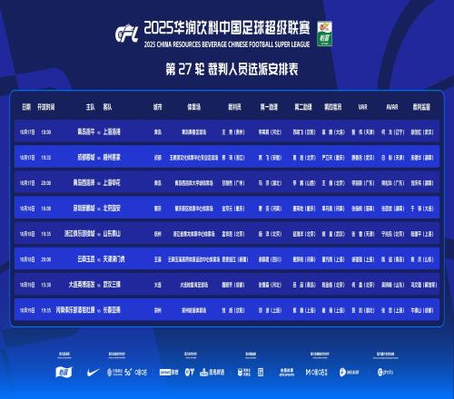 北京时间10月17日,中国足协官方公布了中超第27轮裁判选派安排表。中超第27轮裁判选派青岛海牛 vs 上海海港 裁判员:王竞(贵州)VAR:甄伟(天津)成都蓉城 vs 梅州客家 裁判员:邢琦(浙江)V